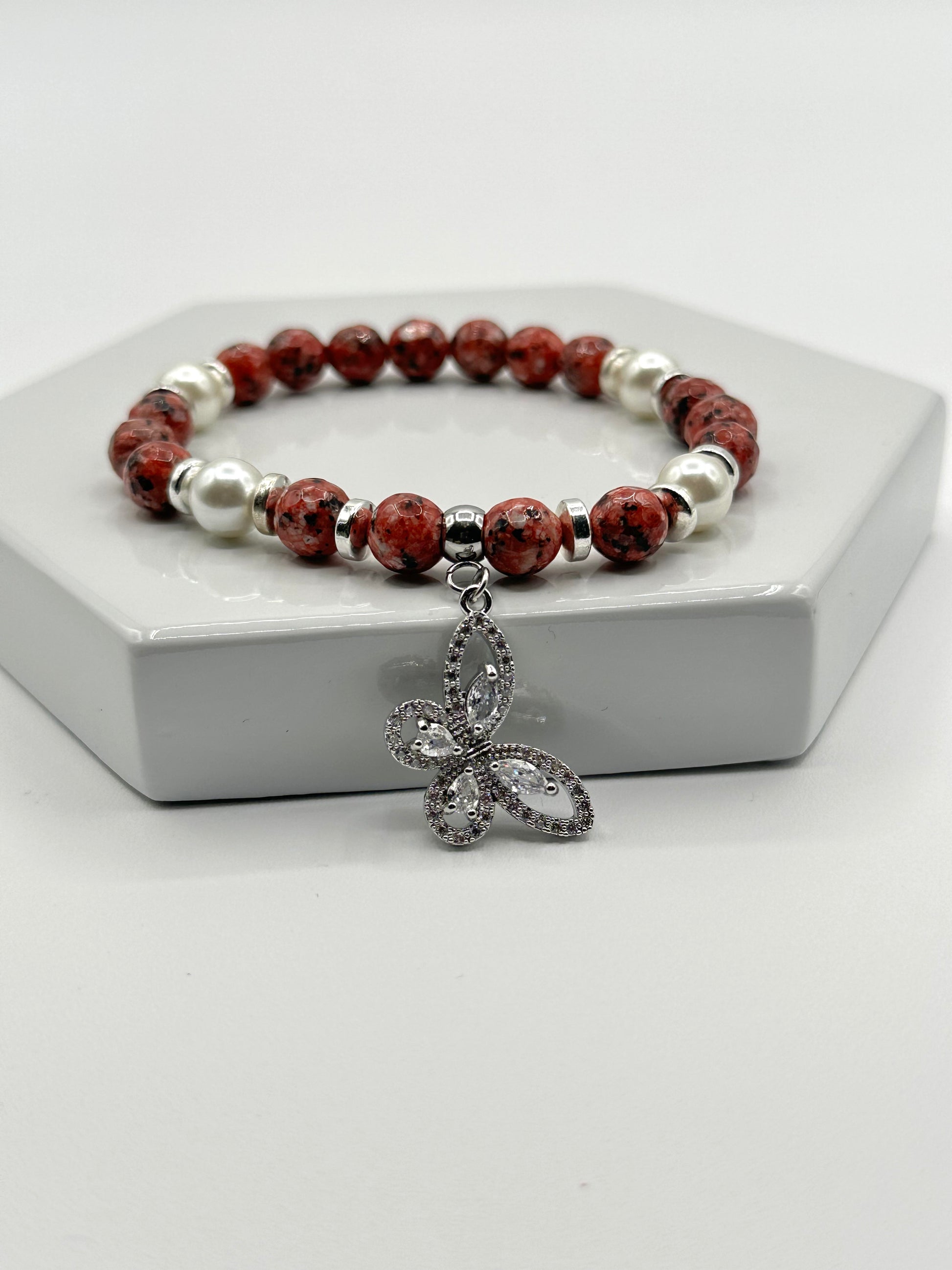 Pulsera de piedras naturales jade, perlas nácar, hematites y dije de bronce con baño de oro.