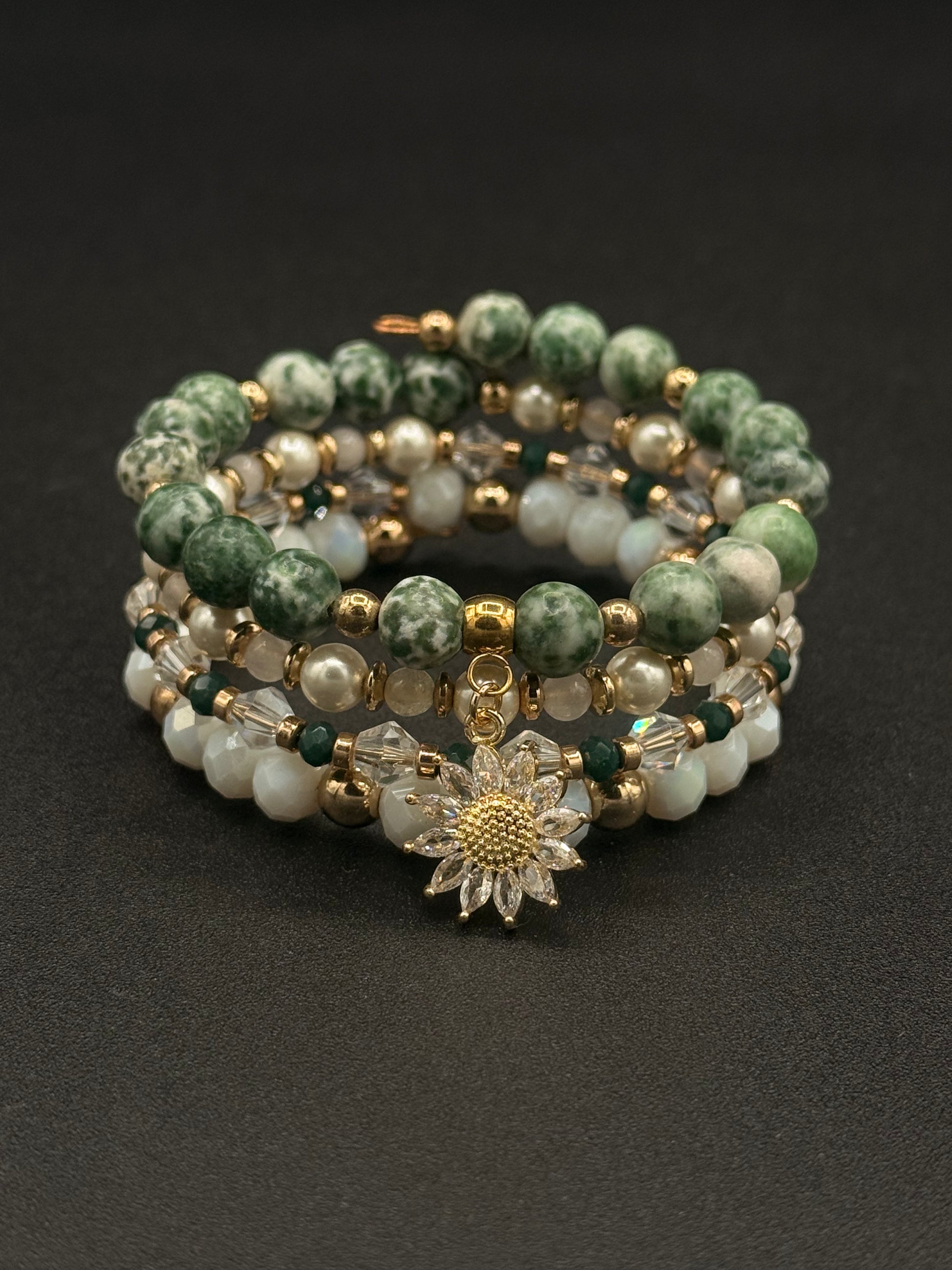 Pulsera en alambre de memoria de piedras naturales mármol faceteado, perlas nacar, hematites, cristales checos, dije de bronce con baño de oro.